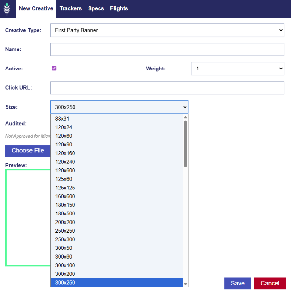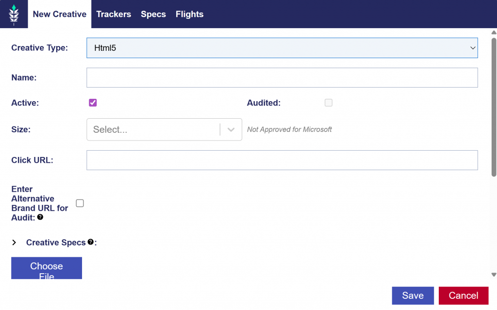 Navigate to Advertiser > Creatives > Click the New Creative button. On the New Creative window, select First Party Audio as the Creative Type, enter a Creative Name, then choose: