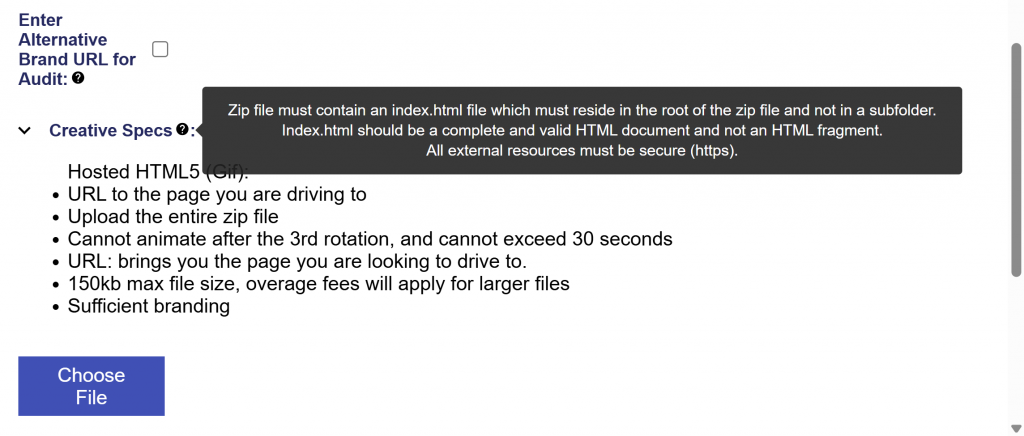 Users can upload an HTML5 creative package as a zip file, containing all required assets. Once uploaded, the package is stored in Amazon S3 so it can be retrieved later for hosting on platforms such as DCM or Kevel. At this stage, the transfer to these hosting platforms will be handled manually. The platform will also provide a creative preview, allowing users to validate the uploaded assets before activation. Auditors will enter or update the HTML in the audit screen, and all existing audit fields remain visible and available within both the RTB Creative Audit screen and the upload/details windows. HTML5 creatives will participate in banner/display bid requests, enabling them to serve within the same inventory as standard display creatives.