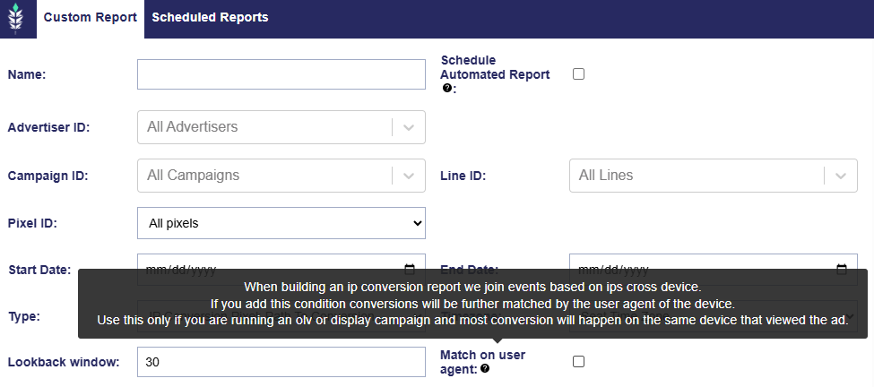 Customize the attribution lookback window for your IP Conversion Pixels by selecting from ‘5’, ‘7’, ’15’ or ’30’ from the ‘Lookback window’ dropdown when building your custom report.