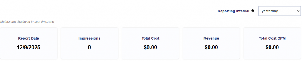 Above the Metric Tiles on all levels (Advertiser, Campaign, and Line) a tooltip reminder says: Metrics are displayed in seat timezone.