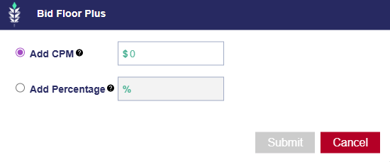 Only the input field for the selected option is active; the other remains disabled. When the user selects an option and saves, the chosen adjustment applies directly to bidder logic so that all bids reflect the Floor Plus configuration.