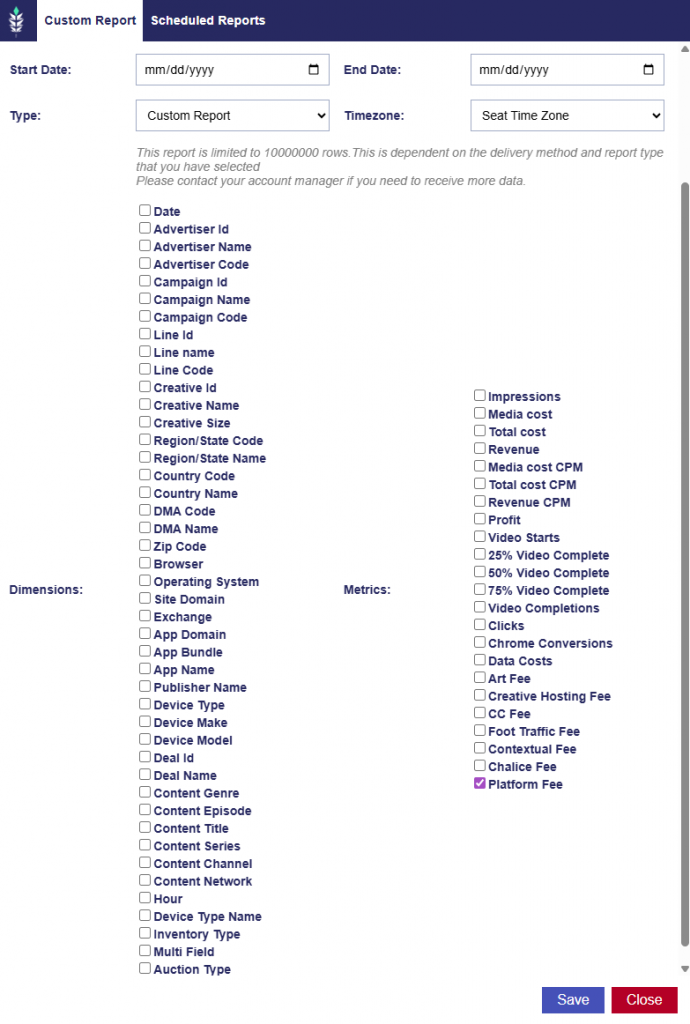 In Custom Reporting, Platform Fee has been added as a selectable metric. The Platform Fee represents the portion of spend retained by the platform as margin. This metric provides increased transparency into fee structure and cost breakdowns within reporting.