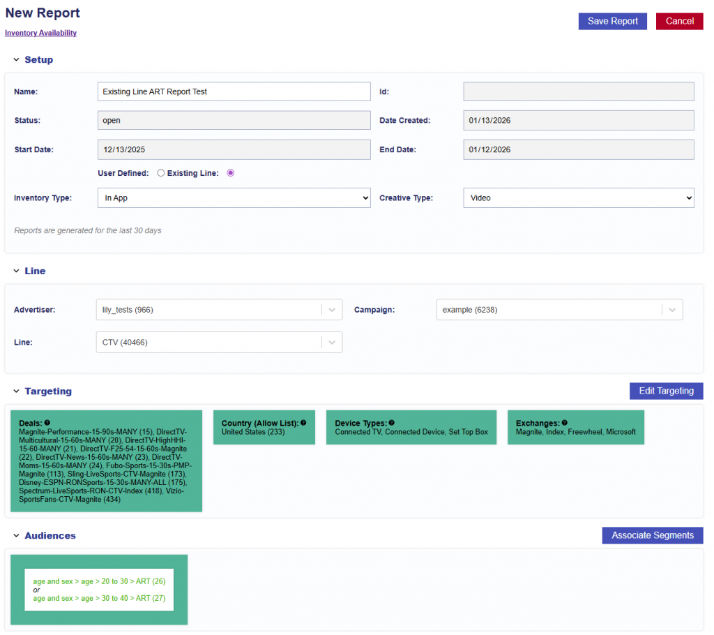 Existing Line: Select an Advertiser, Campaign, and Line to inherit targeting and audience configurations from an existing line. Inventory Discovery is not available for this option, but users can adjust targeting parameters and audiences as needed.