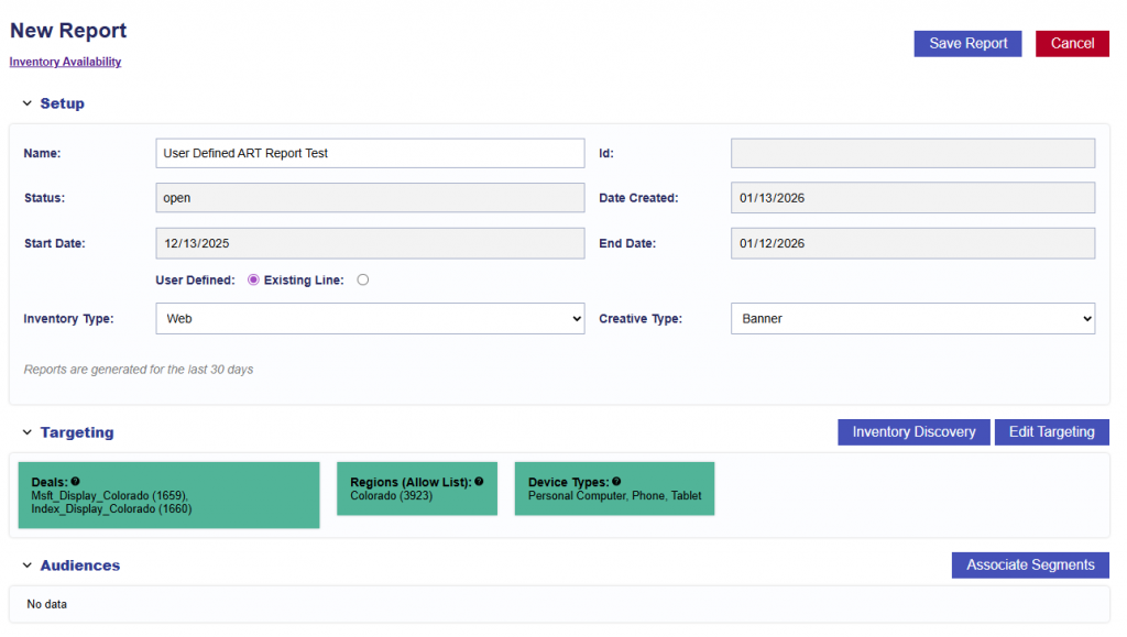 User Defined: Create custom targeting using deals, exchanges, geographies, livestream, apps, device types, channels, and more. The Inventory Discovery feature is available when this option is selected.