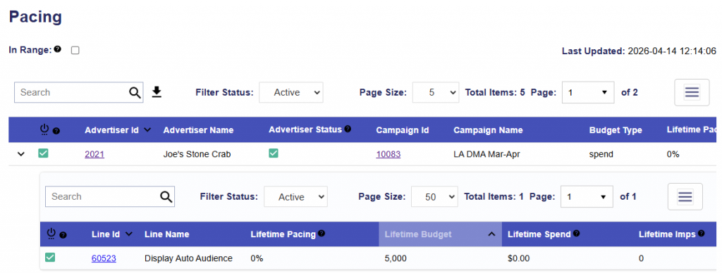 The new Pacing tab is a report designed to facilitate the management of many Line Items at once. From pacing to performance, this report summarizes all key metrics for each Line Item in your seat, making any potential issues easily identifiable at a glance. Check for a pulse on all your active campaigns, identify any issues with pixel placement, and assess pacing for all your Lines and Advertisers in one consolidated report. This report is updated each day at 6 am EST with metrics for the previous day.