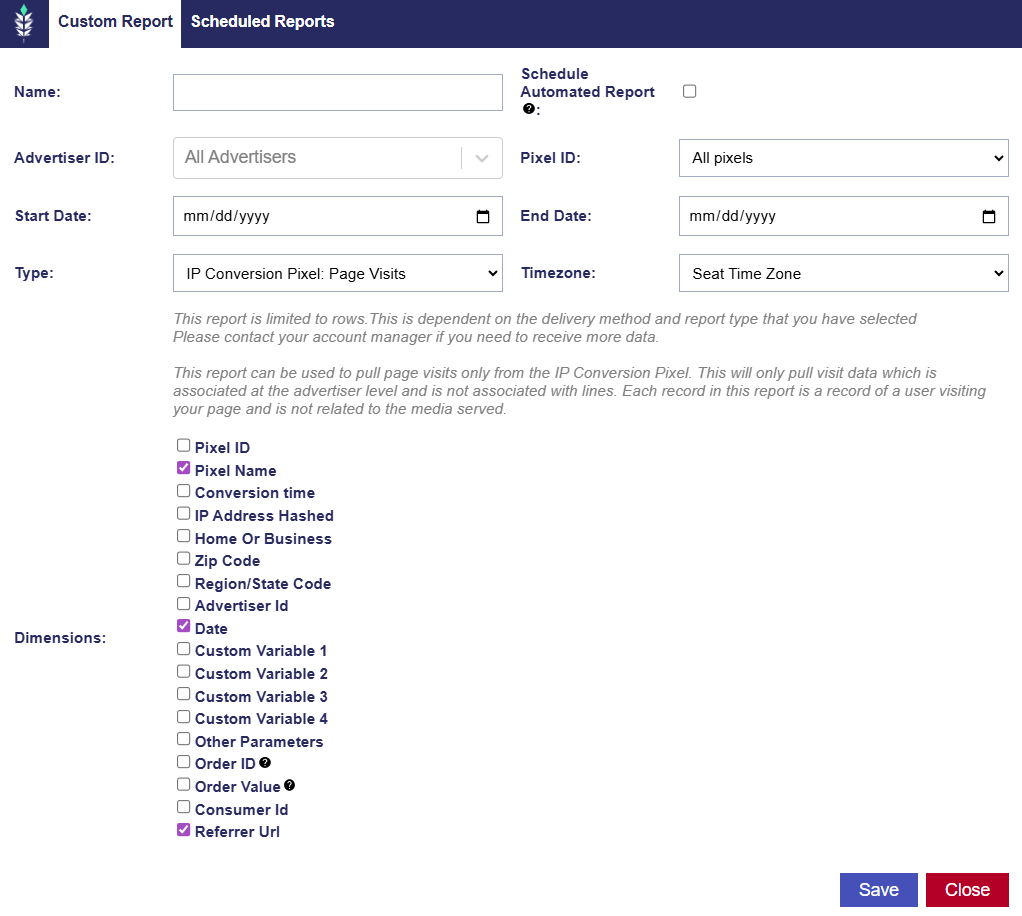 When generating an IP Conversion Pixel: Page Visit report, the Referrer URL has been added as a selectable dimension. This report pulls page visits only from the IP Conversion Pixel at the advertiser level and is not associated with lines or media served. Each record represents a user visiting your page based on a pixel fire. The Referrer URL indicates where the visitor came from before landing on your site, when available.