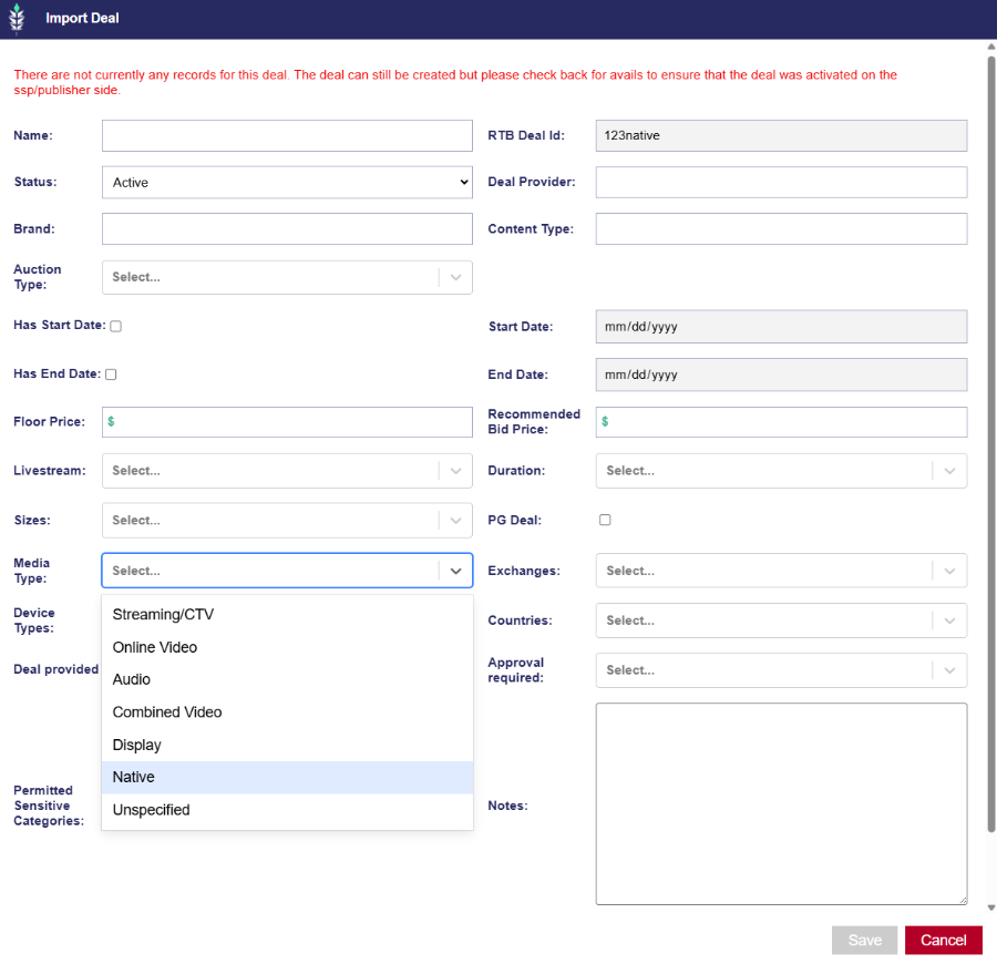 When importing deals, users now have the option to select Native as a Media Type, enabling support for native specific inventory.